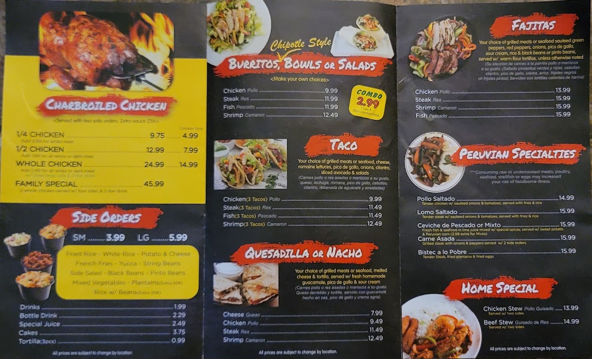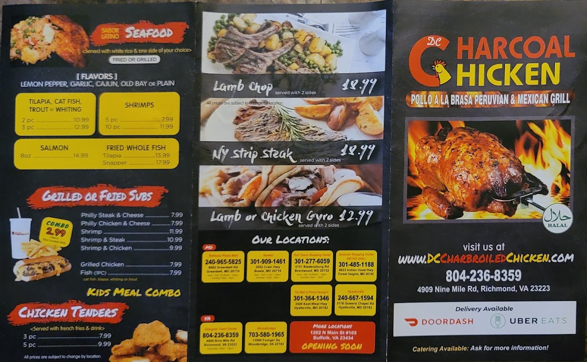 Dining at Dc Charcoal Chicken & Grill (4909 Nine Mile Rd, Richmond) feels like taking a quick tour through Latin flavors, with a menu that covers comfort food, grilled classics, and seafood staples. If you want something hearty and home-style, the Home Special section is a solid starting point with Chicken Stew - Pollo Guisado and Beef Stew - Guisado De Res, both reading like warm, filling plates. For handheld favorites, the taco lineup keeps it straightforward with Fish (Pescado) (3 Tacos), Shrimp (Camaron) (3 Tacos), Beef (Res) (3 Tacos), and Chicken (Pollo) (3 Tacos), while the cheesy options expand into Quesadilla or Nacho: Shrimp (Camaron), Cheese (Queso), Steak (Res), and Chicken (Pollo). If you prefer a build-your-own vibe, the Burritos, Bowls or Salads (Chipotle Style): Chicken / Pollo, Shrimp / Camarón, and Steak / Res make it easy to pick your protein and keep things lighter. Seafood fans have plenty to scan through under Sabor Latino, including Tilapia, Catfish, Salmon, Trout, and Whiting, and there’s also a simple crowd-pleaser in Chicken Tenders: Chicken Tender. The Peruvian side of the menu adds variety with Carne Asada, Bistec De Lo Pobre, Lomo Saltado, Pollo Saltado, and Ceviche De Pescado Or Mixto, while sandwich lovers can go for American Jumbo Burger, Shrimp Sub, Shrimp & Steak, Grilled Chicken, or Chicken & Cheese Sub. The charbroiled chicken section-Family Special, 1/2 Chicken, Whole Chicken, 1/2 Chicken With Side, and 1/4 Chicken With Side-anchors the menu, and sides like Plantains, Potato & Cheese, Side Salad, and String Beans help round everything out. To finish, you can keep it simple with Cake and a Bottle Drink, and if you’re feeling fancy, featured plates like Lamb Chop and NY Strip Steak stand out alongside fajitas such as Mixto, Chicken (Pollo), Beef (Res), and Shrimp (Camaron).